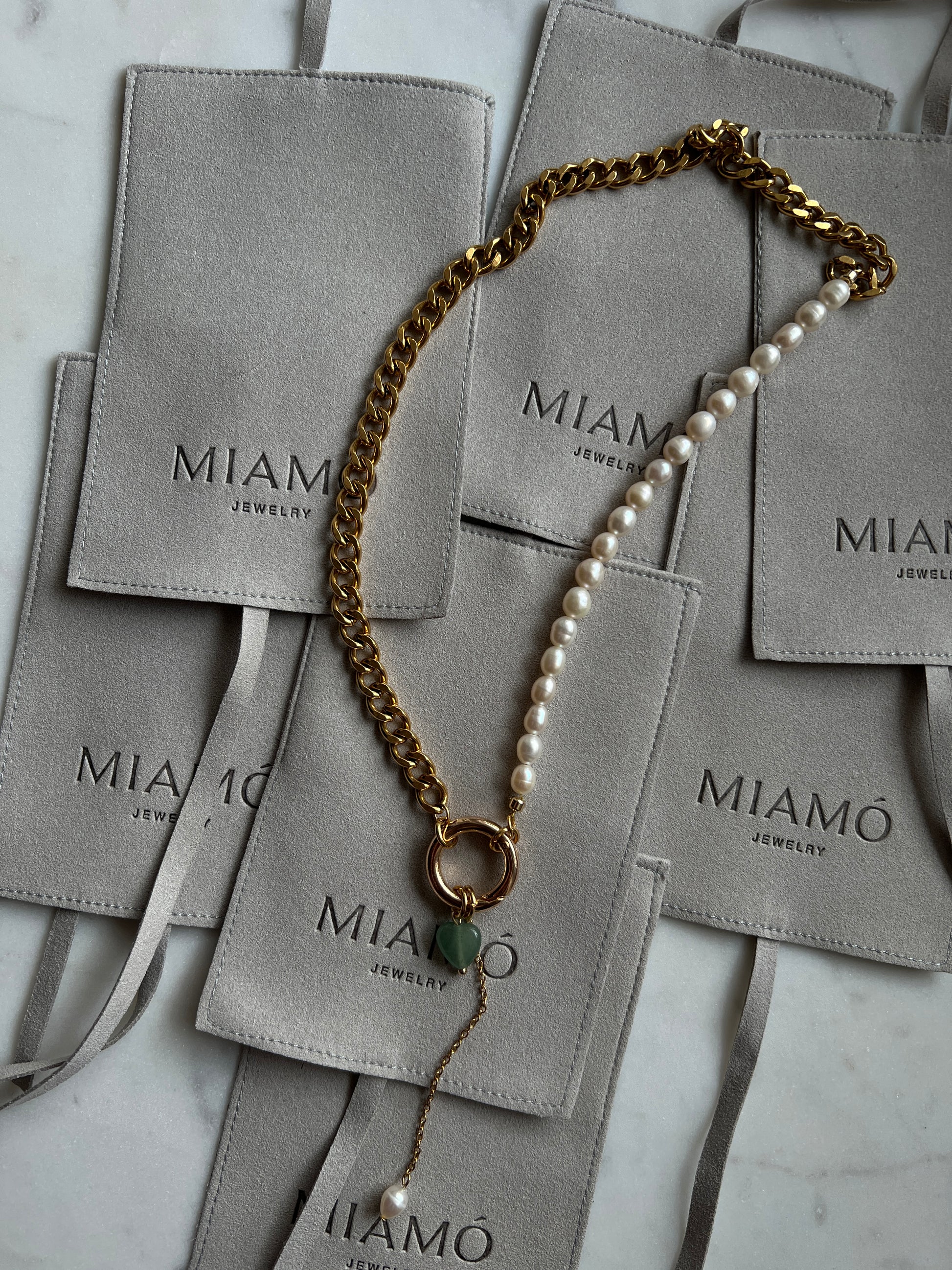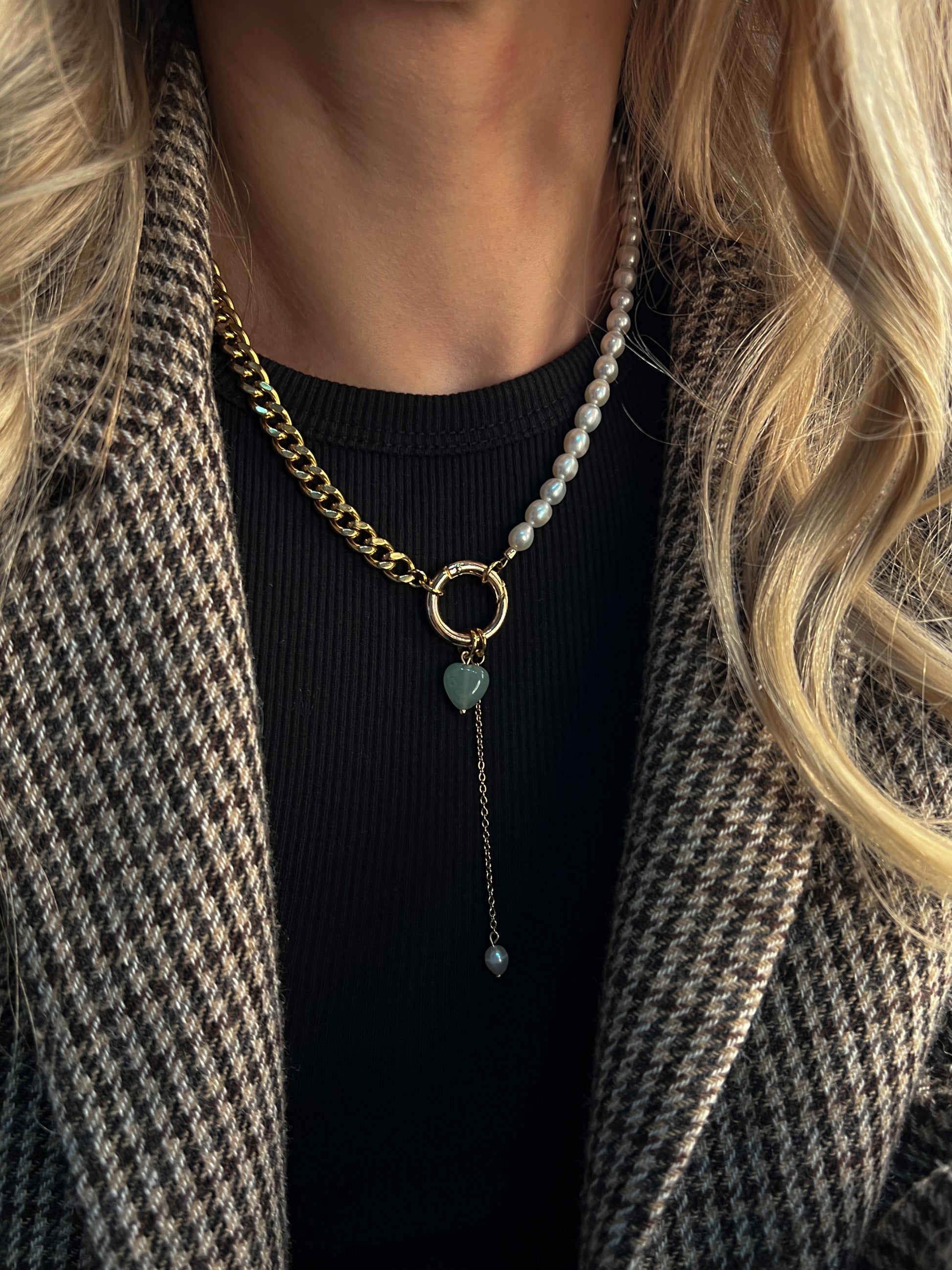 Combination necklace with freshwater pearls, stainless steel and 2 charms